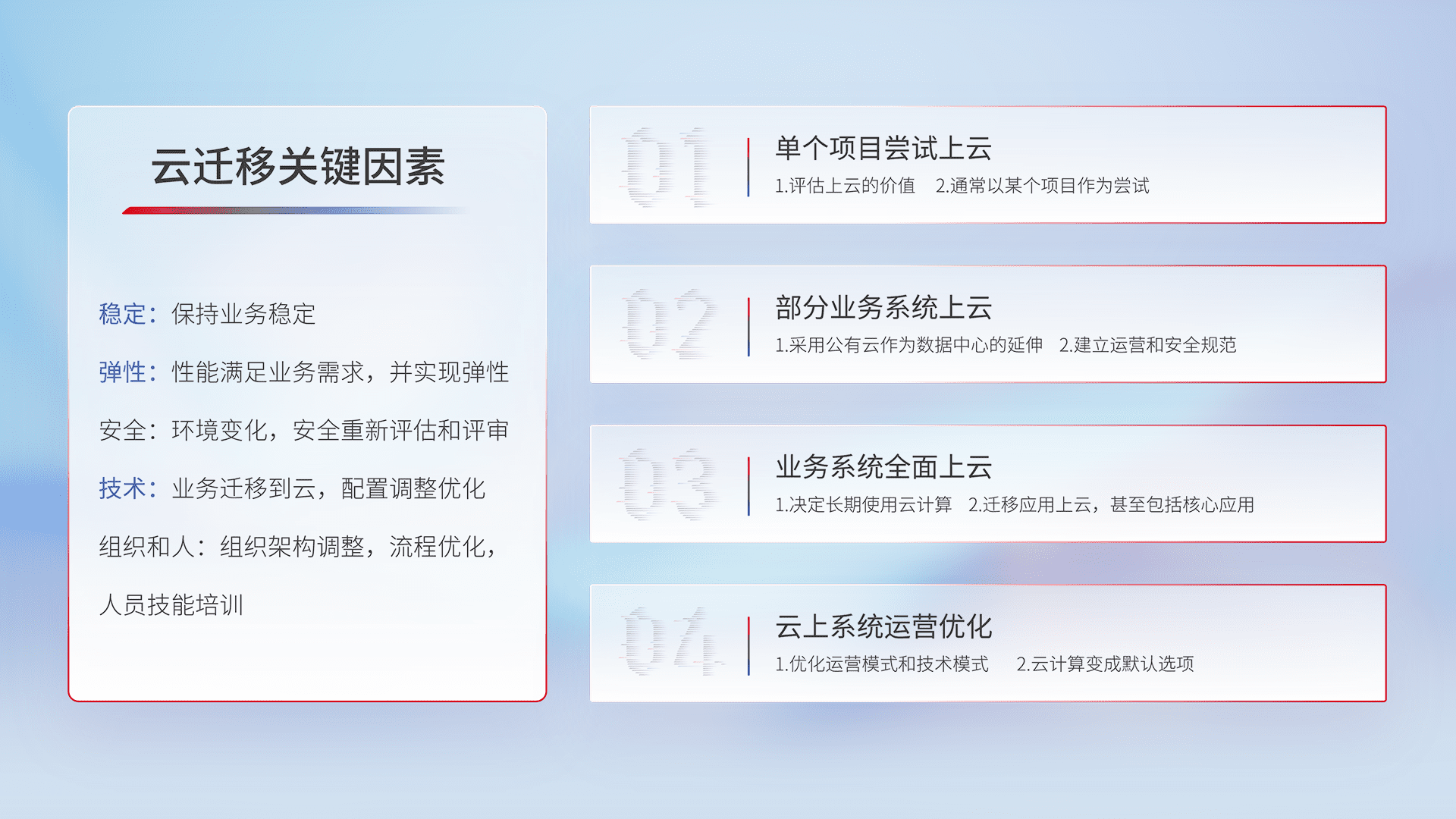结合实际业务,,,,从规划设计、、云平台选型、、、、云原生改造、、数据迁移、、集成交付,,迁移全过程为客户识别最佳上云路径,,,,做好风险识别管理,,,设计网络架构、、、、身份权限、、安全审计合规、、、操作审计、、日志审计、、、监控告警策略、、多站点容灾设计等,,对云上基础设施进行整体规划,,提升IT治理水平,,以满足弹性、、高可用、、、、高性能的需求。。。。