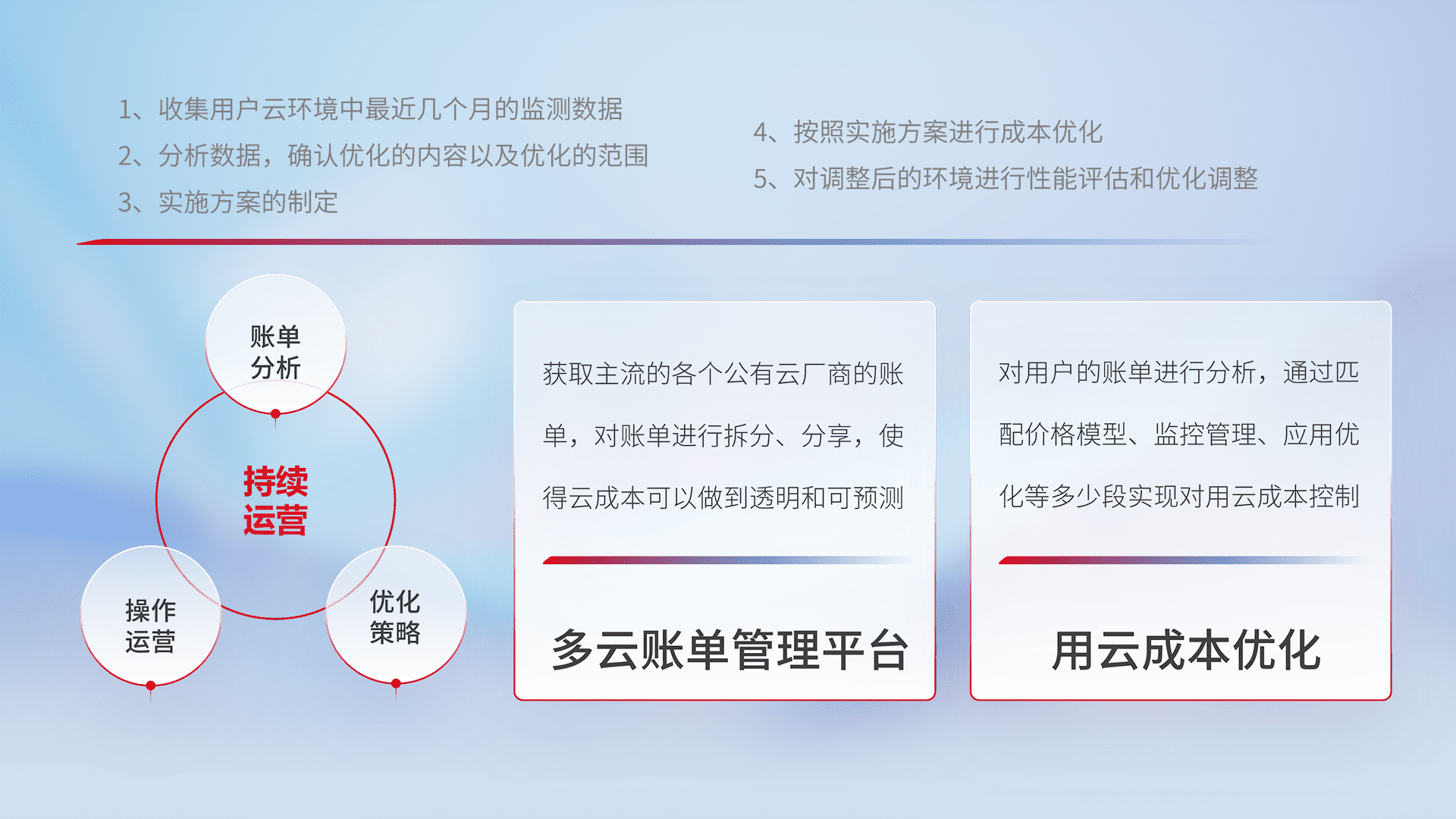 通过多云纳管,,以统一的资源数据模型把客户的云资源进行抽象和封装,,,进而实现对多云资源的统一操作,,,保障云资源管理的可靠性、、、、稳定性与可用性。。量身定制化运维内容,,,配置、、、开发运维、、补丁管理、、、、备份、、、、监控、、、认证和访问管理、、、审计和日常巡检等,,,,保障在用云过程中的可靠度,,,,稳定度以及高可用率。。。